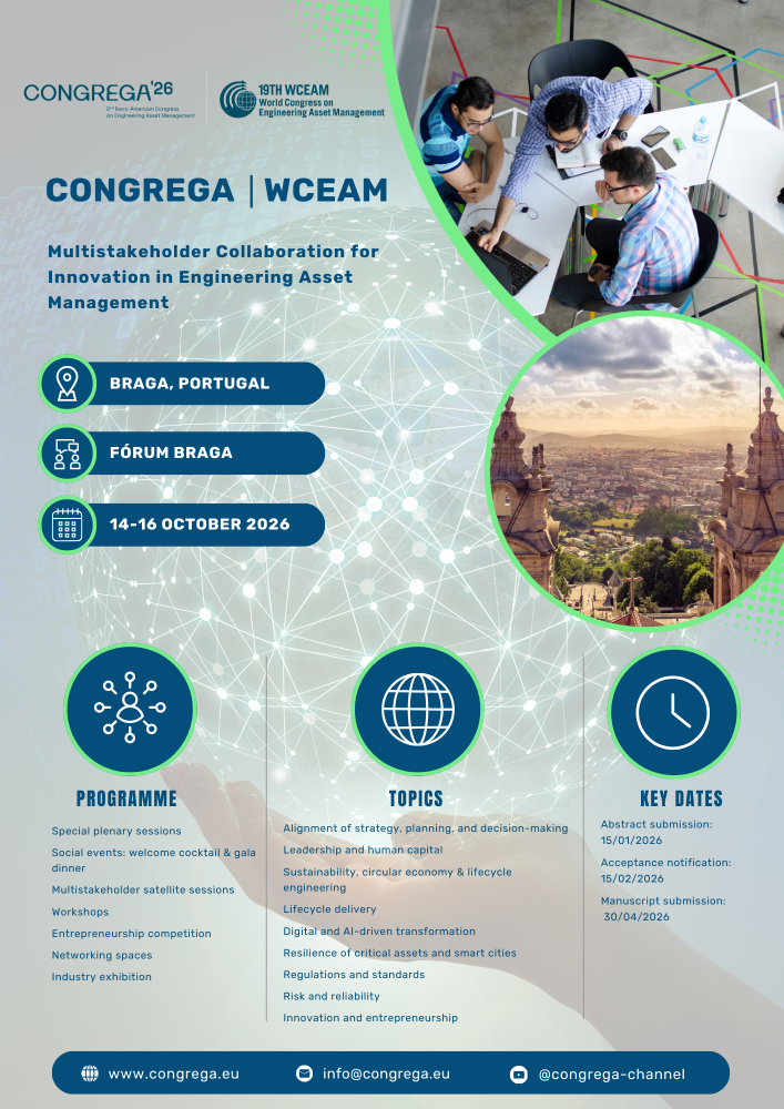 The 19th edition of the World Congress on Engineering Asset Management (WCEAM) will be held in 2026 in Braga, Portugal from 14-16 October 2026, in cooperation with Congrega26.